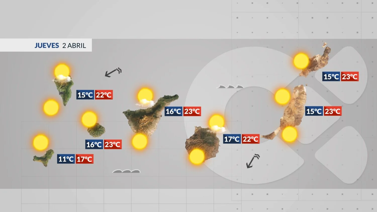 Ce jeudi, la météo reste stable sur l’archipel. La poussière saharienne (calima) qui affectait le ciel tend à disparaître. Le soleil sera l’acteur principal, accompagné d’un vent alizé modéré et de températures printanières.