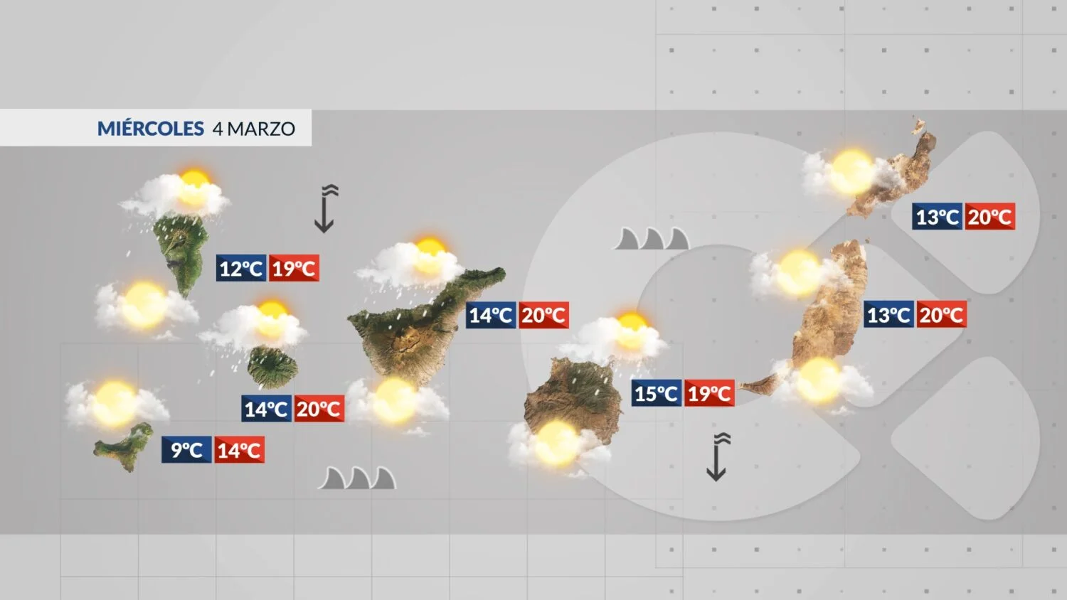 Le sud, plus dégagé, pourra connaître un peu de calima. Les nuages couvriront une bonne partie du nord et de l’ouest de l’île, apportant localement des averses. Le vent perdra de son intensité dans l’après-midi.