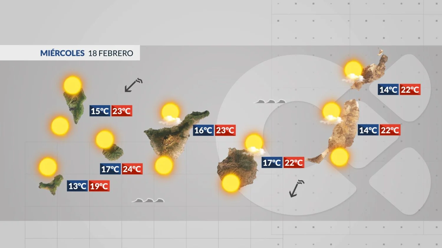 Ce mercredi 18 février s’annonce largement ensoleillé sur l’archipel. La poussière saharienne (calima) se dissipe en matinée, laissant place à un ciel bleu. L’alizé du nord-est fait son retour, apportant un vent modéré qui se renforcera en rafales sur certains secteurs exposés dans l’après-midi. Les températures restent douces pour la saison.