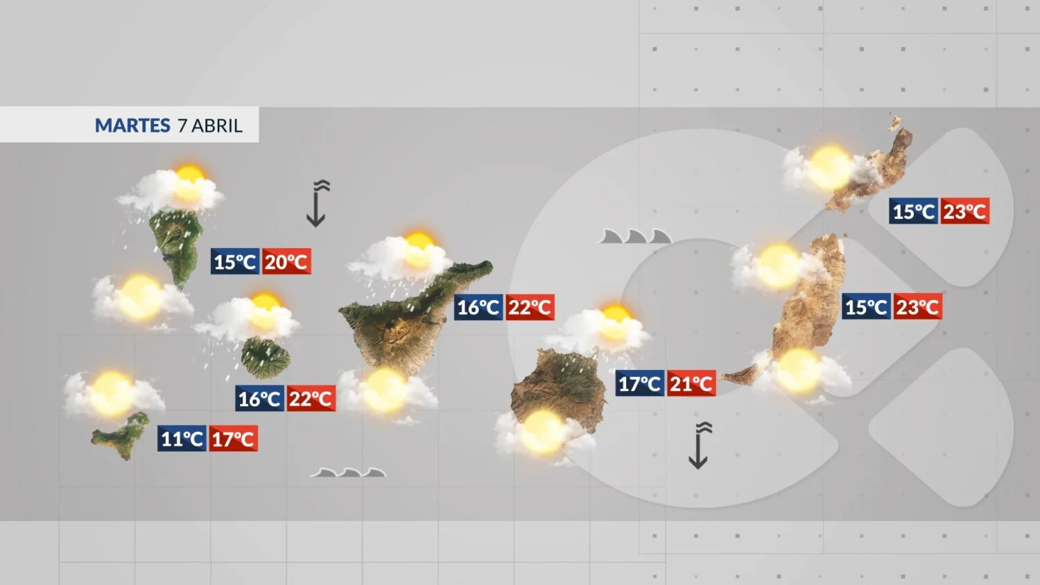 La météo change ce mardi 7 avril aux Îles Canaries. Un front actif, arrivant par le nord-ouest en milieu de journée, apporte nuages et précipitations, principalement sur les îles occidentales et montagneuses. Une baisse générale des températures et un renforcement du vent accompagnent cette perturbation.