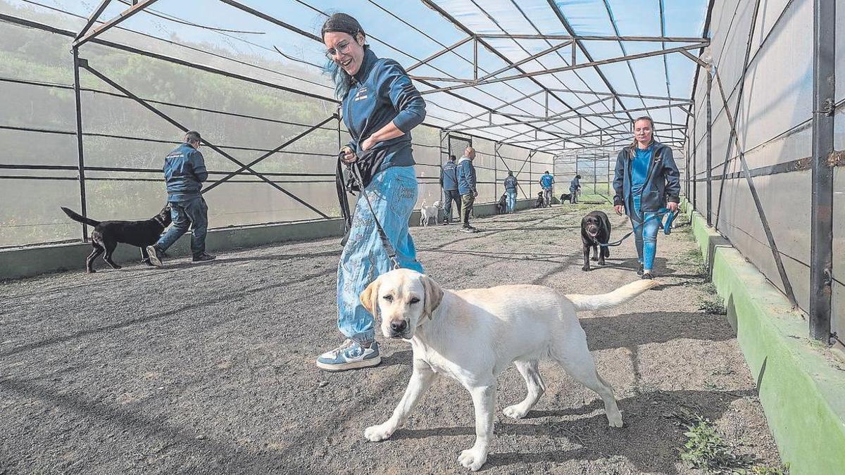 Les chiens reniflent dans la propriété depuis l’âge de quatre ou cinq mois. Neuf labradors et un golden retriever nommé Suggar, arrivés à El Viso en tant que chiots sans expérience. Parmi eux, Soto et Sara, de couleur blanche ; Estela et Emilio, noirs ; Suso, Santi (le plus vif du groupe), Lolo, Lúa et Lisa, tous cinq de la couleur chocolat. Bien que, lors de la matinée du reportage, ils aient un peu l’attitude d’adolescents et se laissent distraire par la caméra, ils savent déjà marcher au pas de l’utilisateur sans le devancer, tourner au bon moment et rester immobiles si la laisse tombe au sol.