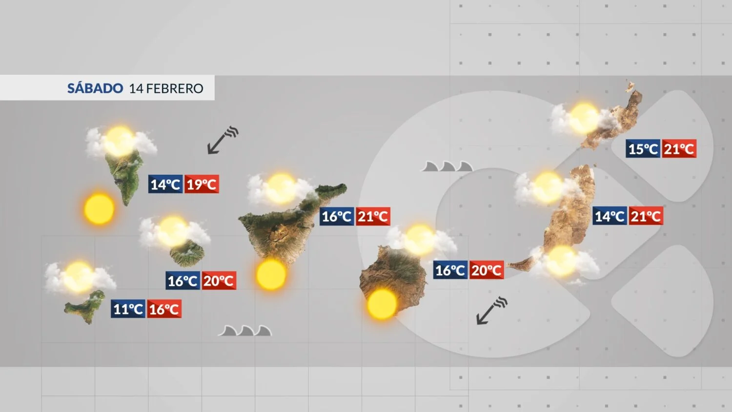 Ce samedi 14 février, la météo aux Îles Canaries sera marquée par un vent du nord-est modéré à fort, accompagné de rafales localement très violentes, notamment sur les reliefs. Le ciel présentera un temps variable, avec des passages nuageux persistants au nord des îles, tandis que le sud profitera d’un grand soleil. Les températures resteront fraîches, typiques de la saison.