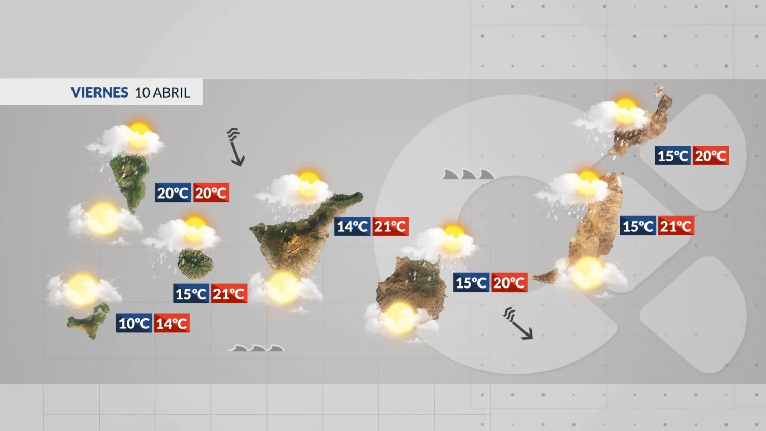 Des nuages et de faibles précipitations sont prévus au nord. Le vent diminuera demain. À Valverde, le mercure oscillera entre 11 et 14°C.